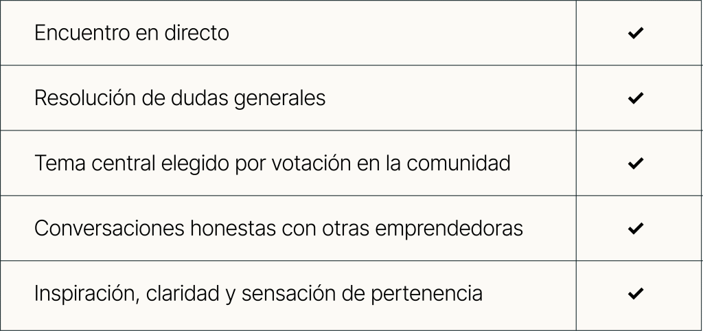 Un espacio de seguridad e intimidad para mujeres que están gestando su marca en soledad y necesitan compartir dudas, desbloquear miedos y sentir el apoyo real de otras emprendedoras.